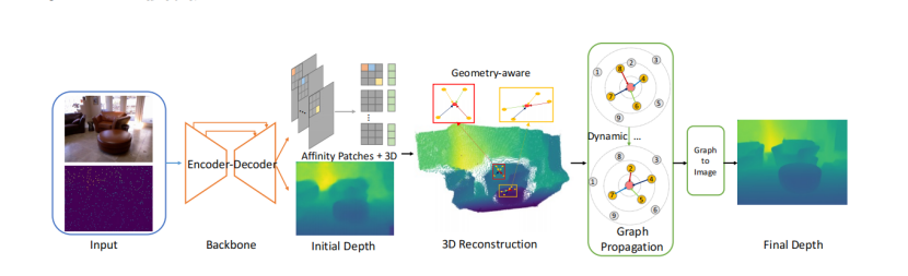 为解决上述痛点,本论文提出了GraphCSPN (Graph Convolution based Spatial Propagation Network),一种基于图卷积的空间传播网络,来完成稀疏深度图的补全。