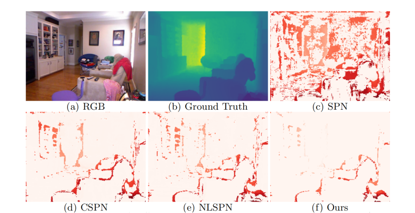 1. 利用对边界的注意力机制来动态更新图网络结构,从而拥有更优秀的几何感知能力,捕获局部信息和全局深度的关系,更好地进行深度补全。在下图中,红色内容表示处理后的深度图与理想深度图之间的误差,可以明显看到,与传统方法(图c-e)相比,GraphCSPN(图f)在物体边界位置具有更小的深度误差。