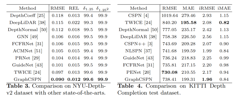 3.在室内NYU-Depth-v2和室外KITTI数据集的测试中,GraphCSPN 均可以得到最佳成绩。