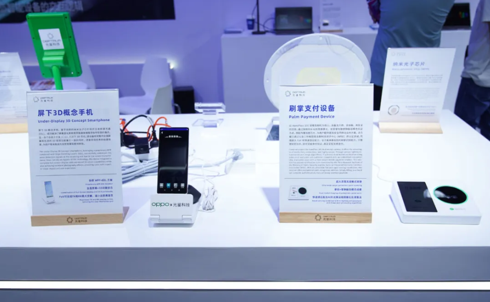 与此同时,刷掌设备和屏下3D概念手机等设备也同样吸引了到场观众的关注和体验。刷掌设备以HandPass 100 刷掌相机为核心,采用掌纹和掌静脉双模态成像方式,保障了刷掌验证的精准度,为用户提供了更加安全可靠的身份识别体验。而屏下 3D 概念手机则凭借自研纳米光学芯片,有效解决了屏幕透光率低的问题,实现了屏幕的外观完整性与拍照性能的兼顾,推动了智能手机屏幕技术的发展。