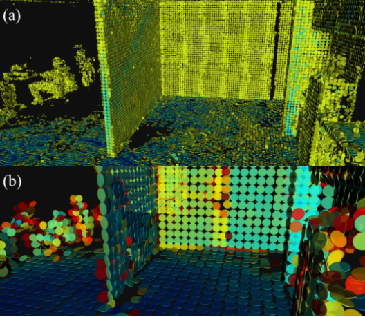 得益于平面协方差矩阵的紧凑形式,我们能够增量更新合并后的平面。单个体素和跨体素的不确定度更新具有统一的增量形式。因此,合并后的平面仍然具有完备的不确定度表达。通过合并,一个大平面特征只需一个或少量体素即可表示,进一步减少了内存占用。此外,在噪声水平相同的情况下,通过体素合并能够更加准确地估计平面,进而提高SLAM 精度(如下方示意图,理论证明请参考论文V-C小节)。