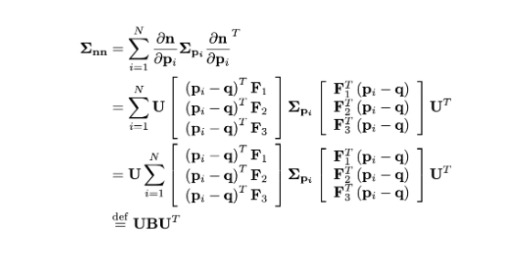 除此之外,Probabilistic VoxelMap 需要存储每个体素的历史点云数据,并在新的观测点加入时重新遍历所有点,以更新体素平面的不确定性。这是由于计算平面的协方差矩阵时,需要计算法向量对逐个点求导的雅可比矩阵。其中,点p以及点p的协方差矩阵是和观测有关的项(以下简称观测项),q, F, 和U是和平面点集总体分布有关的项(以下简称分布项。q代表点集均值,F和 U是由 SVD 结果构成的矩阵,详细过程请参考论文)。当新的观测加入时,由于雅可比矩阵所包含的分布项会发生变化,需要将每个点再次代入公式,重新进行求导。