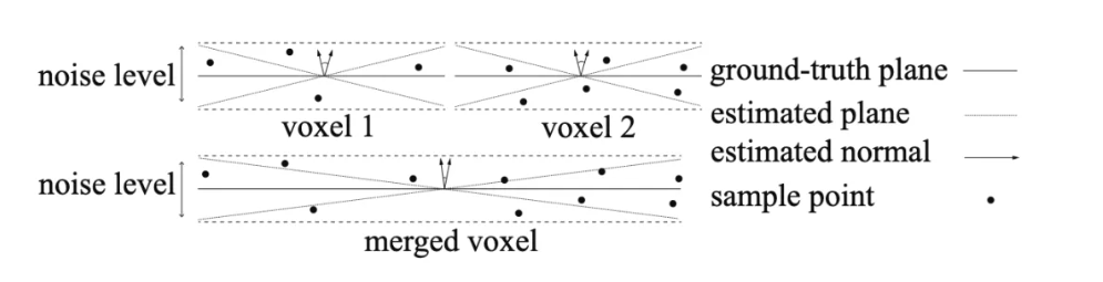 为了进一步解决bias-variance trade-off难题,我们引入了一种体素合并策略,使其能够动态适应真实世界中的大平面特征。这一步的难点是如何保证合并效率,如果采用暴力搜索的方式,将会影响到算法的实时性。
