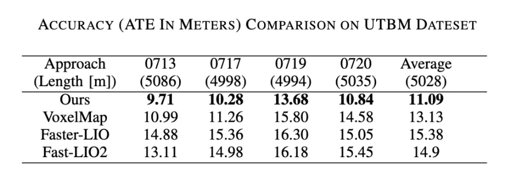 在 UTBM 数据集测试中,C3P-VoxelMap 相比SOTA 方法实现了 20% 的精度提升。