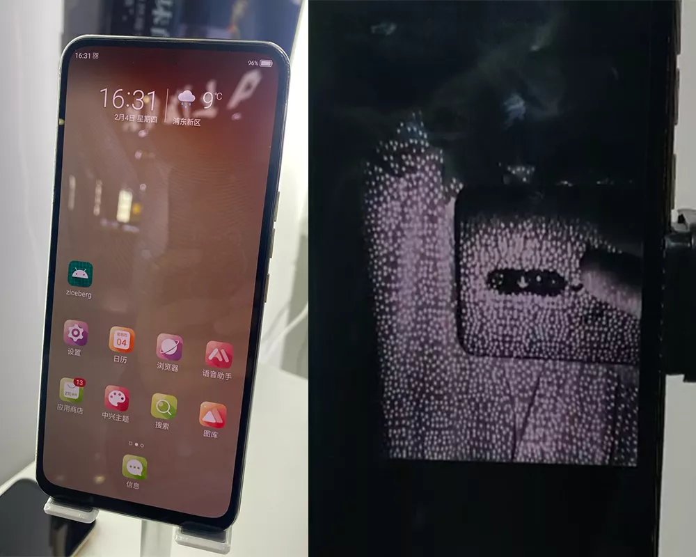 ▲左:中兴第二代屏下摄像头样机,右:光鉴科技屏下3D结构光系统投射的红外点阵影像