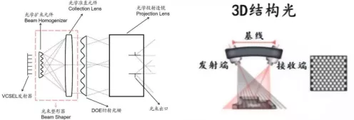 3D结构光模组包括发射端(点阵投影器和泛光感应元件)和接收端(红外摄像头),原理如下: