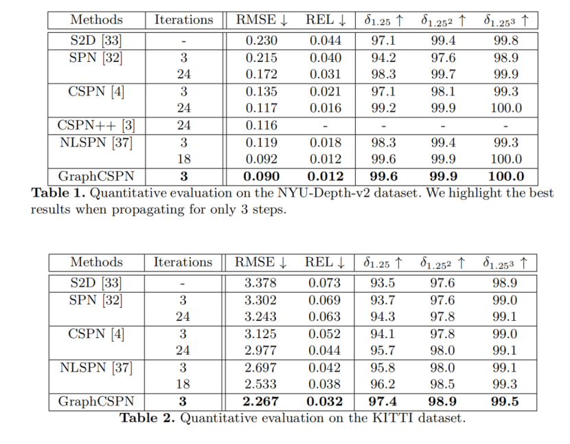 3.在室内NYU-Depth-v2和室外KITTI数据集的测试中,GraphCSPN 均可以得到最佳成绩。