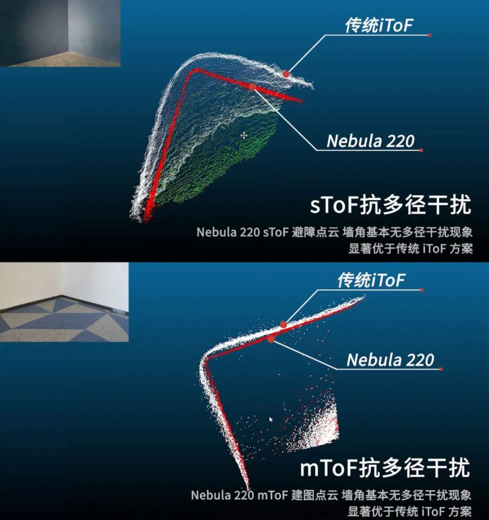Nebula 220强大的感知能力使得机器人具备高精度的地面障碍物识别能力,可以精准分辨不同颜色、尺寸的常见居家障碍物。在抗多径干扰方面,Nebula 220相较于传统iToF方案具备明显优势。在iToF方案常常出现多径干扰的墙角处,Nebula 220的sToF方案在避障点云和mToF的建图点云中均无多径干扰现象,能够精准完成避障及建图工作。