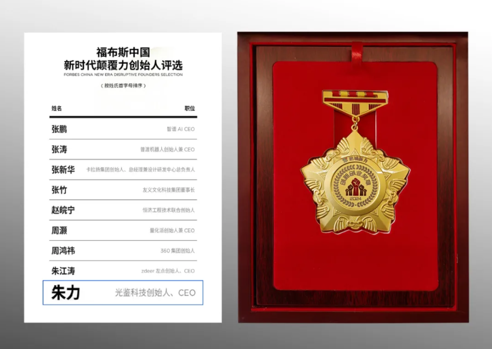 近日,光鉴科技创始人、CEO朱力博士荣获由福布斯中国颁发的2024“新时代颠覆力创始人”和深圳市新的社会阶层人士联合会颁发的“创新创业奖章”两项殊荣,这是对其科技创新能力与行业影响力的高度认可,也标志着光鉴科技在推动行业进步与科技发展中的领先地位。